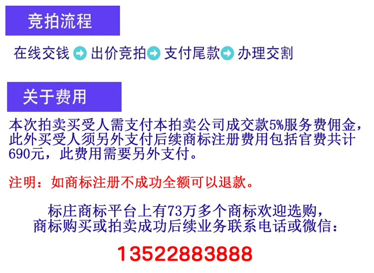 商标的注册等手续一切流程走线上,无需买受人奔波,资料可快递。竞拍成交后,买受人原冻结的保证金自动转化为成交款,买受人须在成交后7个自然日内在线支付尾款,逾期视为买受人违约,保证金不予退还。在线支付完尾款后,买受人务必联络标庄商标拍卖付先生办理后续交割事宜。